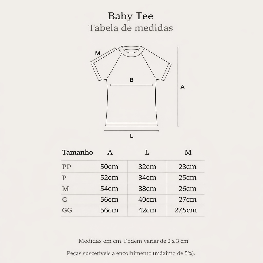 Camiseta Baby Tee confeccionada em malha comfort com 95% algodão e 5% elastano e gramatura de 195 g/m², gola canelada e mangas raglan.